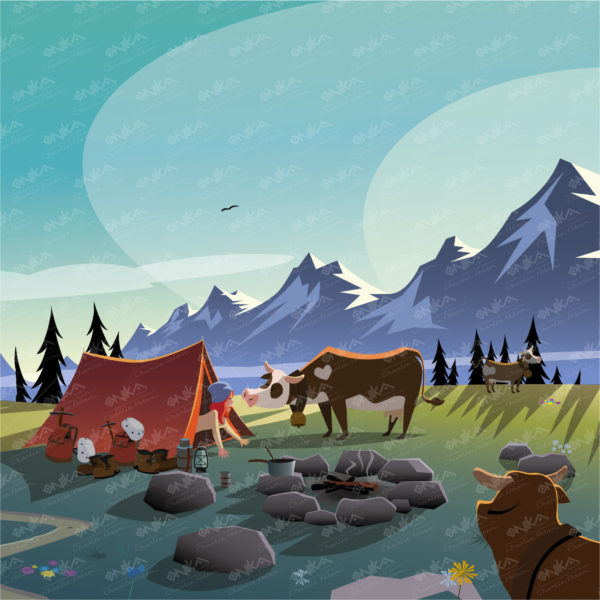 Animal, Animaux, Bivouac, Camping, Champs, Ciel, Coeur, Fleurs, Montagne, Oiseaux, Prés, Sacs, Tente, Vaches